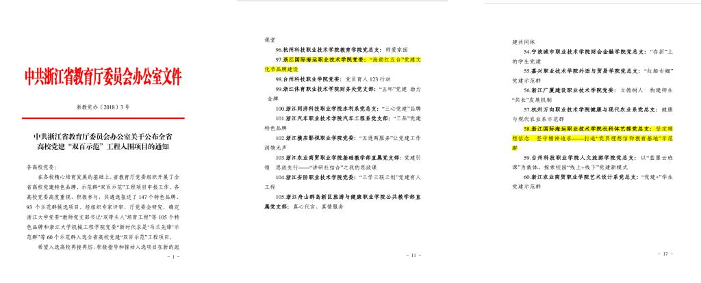 近日,浙江省教育厅公布了全省高校党建“双百示范”工程入围项目名单,我校党委“海韵红五台”党建文化节品牌和我校社科体艺部党总支“坚定理想信念 坚守精神追求——打造‘党员理想信仰教育基地’示范群”成功入选,分别被评为“首批全省高校党建特色品牌”和“首批全省高校党建示范群”。