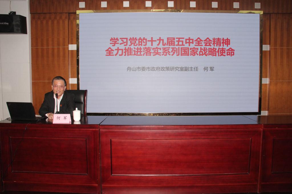 何军以《学习党的十九届五中全会精神 全力推进落实系列国家战略使命》为题,主要从学习十九届五中全会精神和中央规划建议的几点感悟、舟山拥有特殊区位功能是落实全会精神和规划建议的重要支撑、推进重大项目是展现“重要窗口”海岛风景线的硬核保障三个方面切入,结合五中全会的几个新的关键词、中央十四五规划建议中与舟山相关的内容等展开论述。讲座既有理论高度,又有翔实案例,对十九届五中全会精神进行了深入浅出的解读,具有很强的针对性和指导性,使与会人员对十九届五中全会精神有了更深层次的理解。
