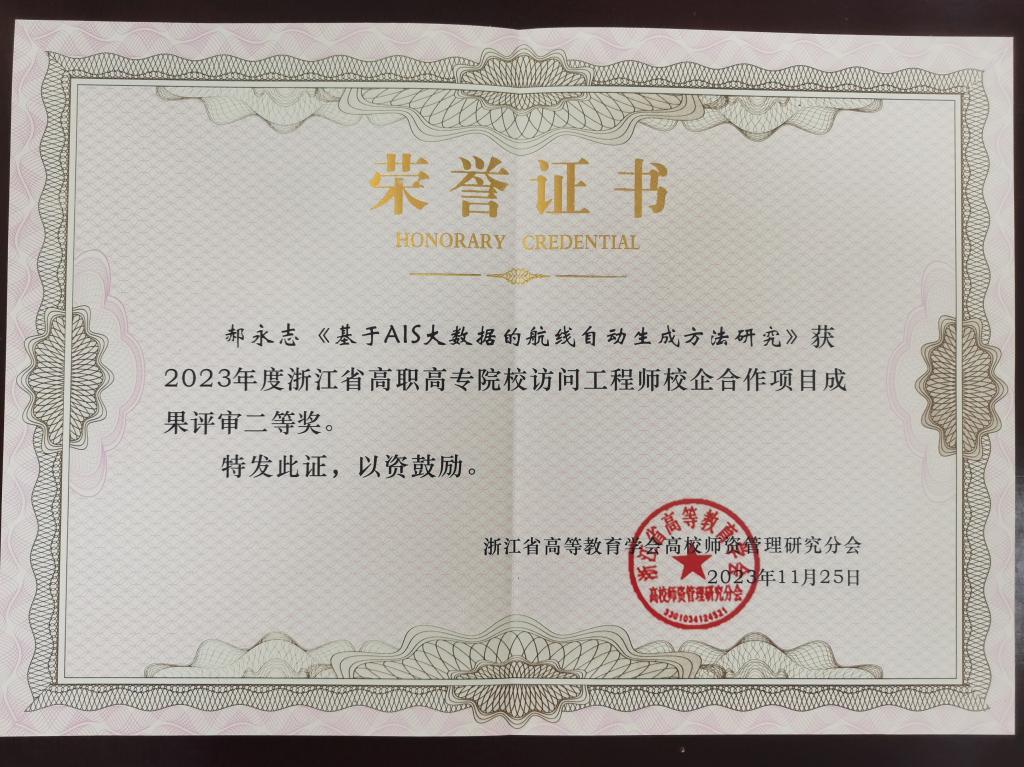 据悉,今年全省高职院校共推荐89个优秀项目参加交流评审,通过首轮网络评审,共选拔20个优秀项目入围现场交流汇报、答辩环节。校企合作项目评审过程注重成果转化导向、质量导向、团队合作导向以及与地方产业转型结合导向。经过激烈角逐,我校航海工程学院郝永志老师主持完成的《基于AIS大数据的航线自动生成方法研究》获得省访问工程师校企合作项目成果二等奖,孙再名导师获得“最佳导师奖”荣誉称号。该项目于2021年立项培育,2023年结题。
