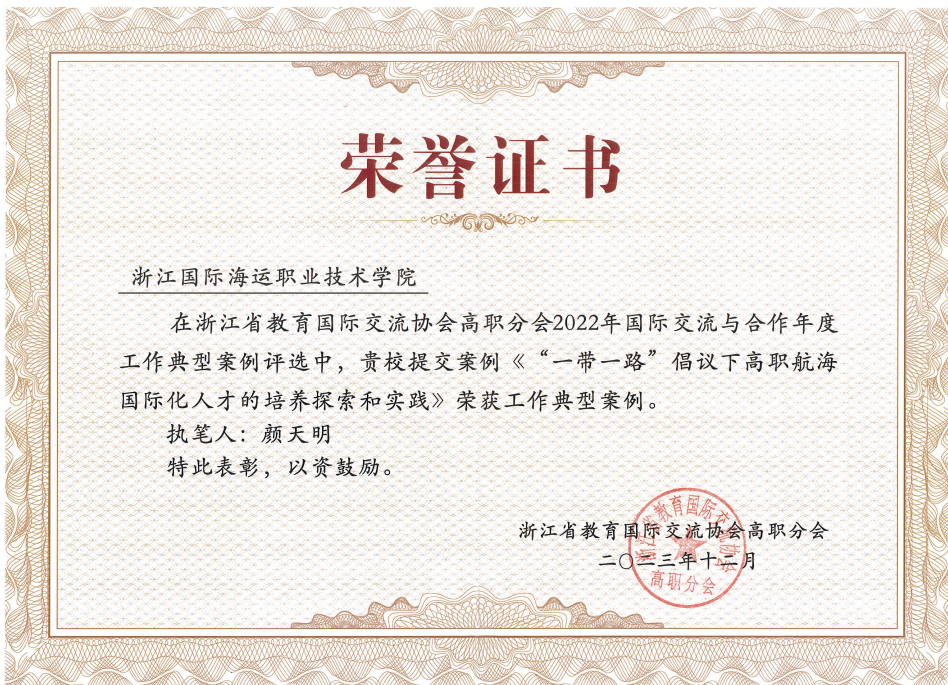 本次年会向会员单位征集工作典型案例32个,我校由颜天明执笔的《“一带一路”倡议下高职航海国际化人才的培养探索和实践》成功入选并荣获工作典型案例,该案例充分体现了我校航海国际化人才培养的成果。