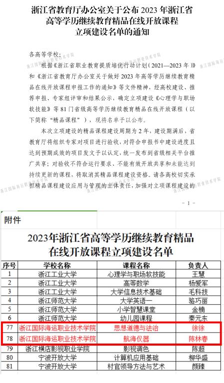 1月23日,浙江省教育厅发布了2023 年浙江省高等学历继续教育精品在线开放课程立项建设名单,我校徐徐老师的《思想道德与法治》、陈林春老师的《航海仪器》等2门课程,经东海教育学院、教务处联合申报脱颖而出,获得立项。这也是我校在省级高等学历继续教育精品在线开放课程建设上零的突破。