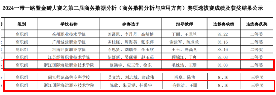 近日,2024一带一路暨金砖国家技能发展与技术创新大赛(以下简称“金砖大赛”)商务数据分析(商务数据分析与应用方向)赛项高职组全国选拔赛圆满落幕。由现代港口贸易学院跨境电子商务和大数据技术专业徐东、应玉莹、范涵宇、陈欣、朱灵涵、任禹宇等6位同学组成的两支队伍,在毛姝洁、王珊老师的精心指导下,分别获得二等奖和三等奖,实现了我校在该项赛零的突破。