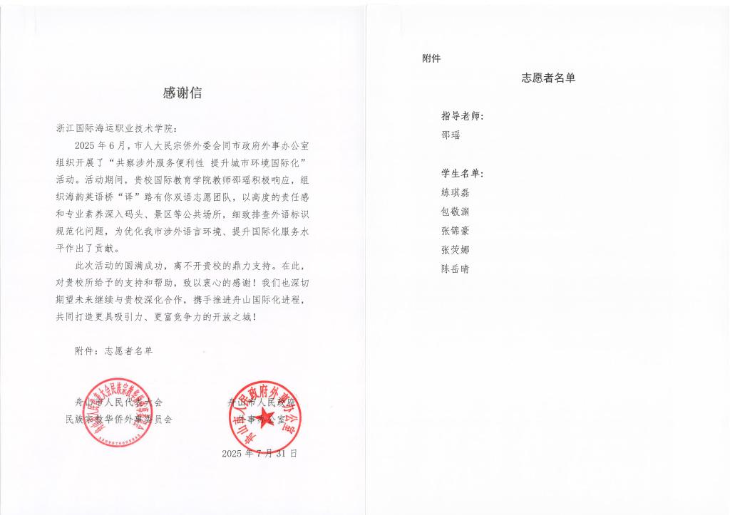 近日,市人大民宗侨外委员会与市政府外事办公室向我校发来联合感谢信,对我校国际教育学院邵瑶老师及其指导的海韵英语桥路有你双语志愿团队在共察涉外服务便利性 提升城市环境国际化专项活动中的突出贡献予以高度肯定。