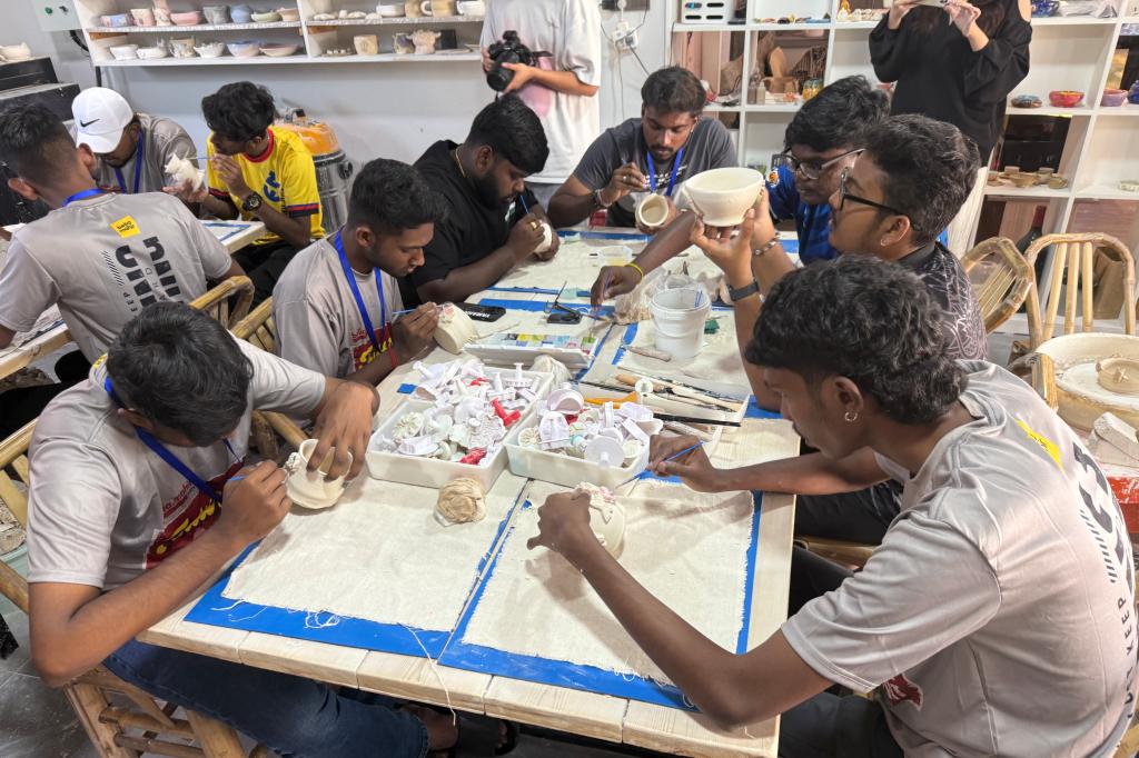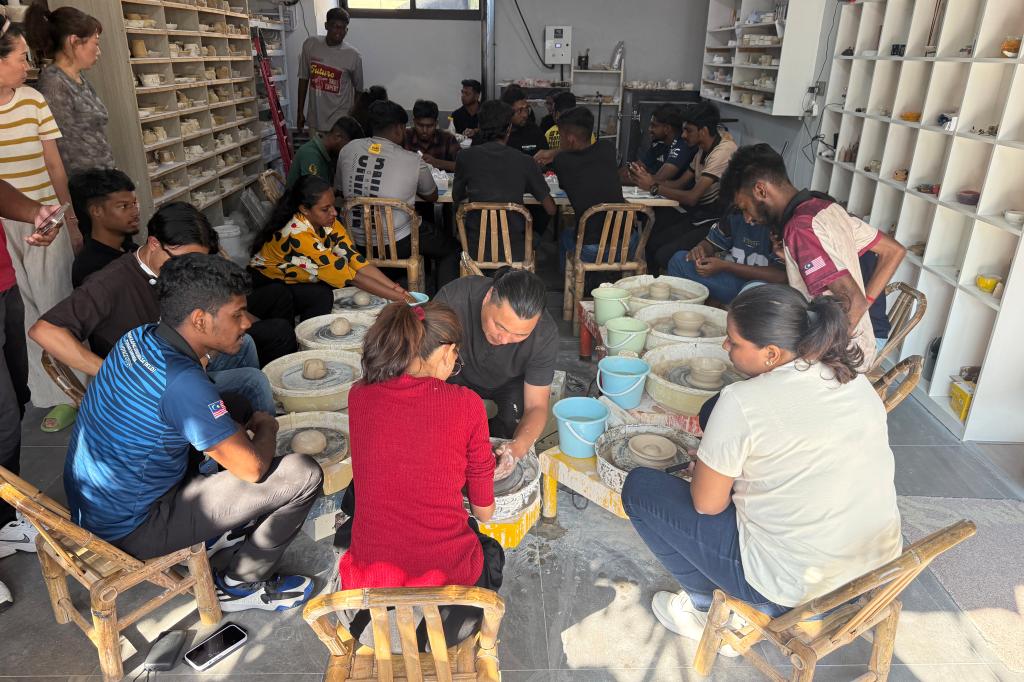 9月12日下午,在现代港口贸易学院罗兰老师的带领下,马来西亚学员们走进展茅路下徐村“听陶”陶艺工作室。活动特别邀请舟山工艺美术学院的丁朝夕老师担任指导,采用“一对一”教学模式,手把手传授陶艺拉胚技巧。学员们兴致盎然地尝试创作,还借助模具制作出带有鱼、虾等海洋生物图案的陶艺小样品,将舟山海洋元素融入作品之中。经过两天的精心烘干,9月15日上午,国际教育学院陈星蓉老师再次带队前往工作室,学员们拿起画笔、蘸取颜料为素胚创意上色,在斑斓色彩与巧妙构思中,深入体会舟山海岛陶艺的独特韵味。