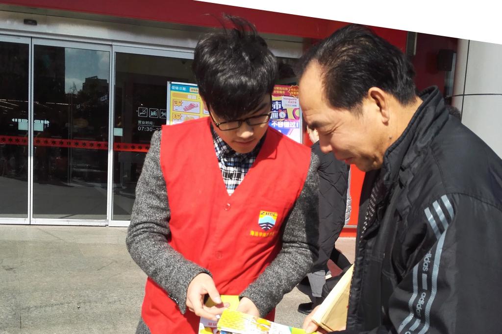 3月15日上午,启航志愿者来到华润万家门口,协助舟山市市场监督管理局新城分局向前来咨询的市民们派发宣传资料,开展了一年一度的消费者权益日宣传活动。