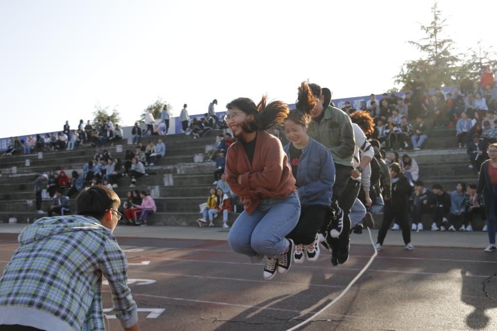 “送鸡毛信”是每班派出4名代表,以4乘100米接力的形式比赛。听到比赛开始的信号后,记熟由抽签决定的6位数字,记熟数字后进行百米跑,用6位数密码代替接力棒,最后一位回到终点后背出对应的数字,准确无误之后停表。“生生不息”是以10人一小组跳长绳的形式比赛。在同学们熟悉的运动中增添小游戏,场上的运动员奋力拼搏,场下的观众高声呐喊,春日的田径场充满了欢声笑语。在这一刻,同学们尽情享受运动带来的快乐。