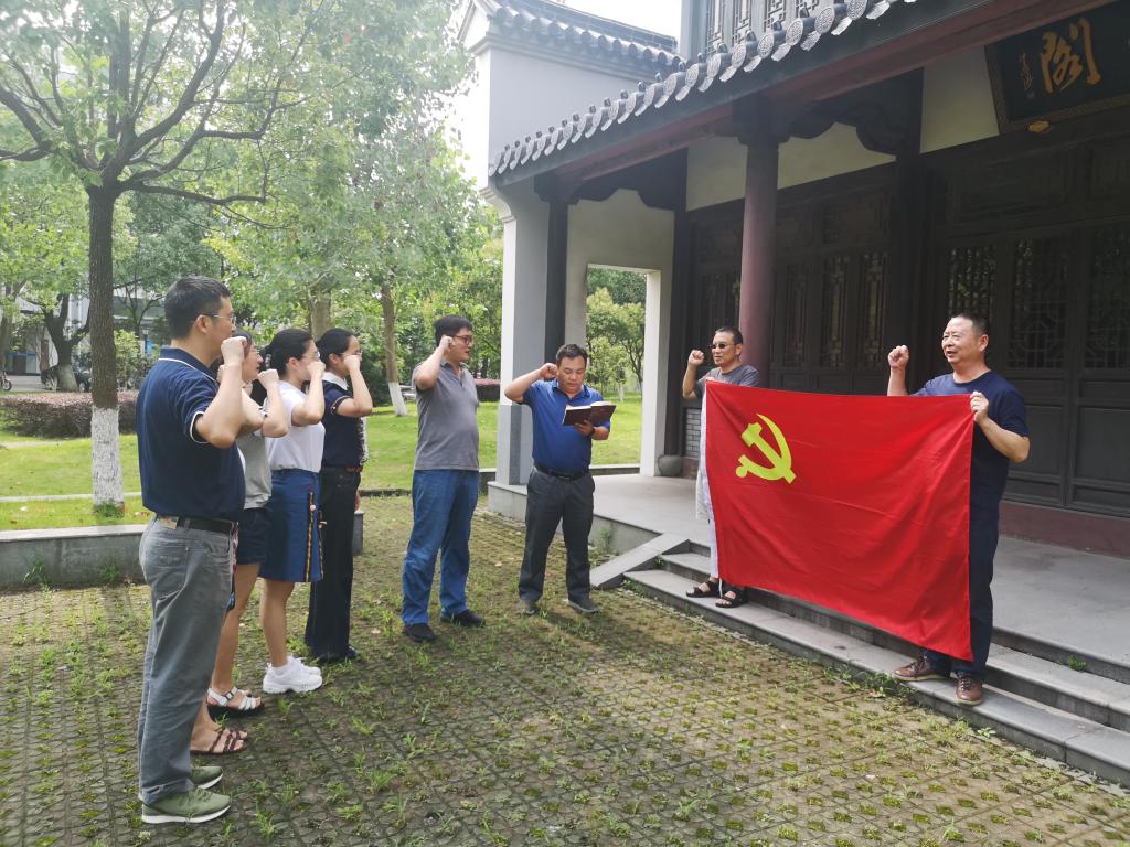 7月4日,支部全体党员同志在校内市级爱国主义教育基地——东海阁,举行“忆初心,师生党员齐宣誓”活动。全体党员一起重温入党誓词,集体庄严宣誓。
