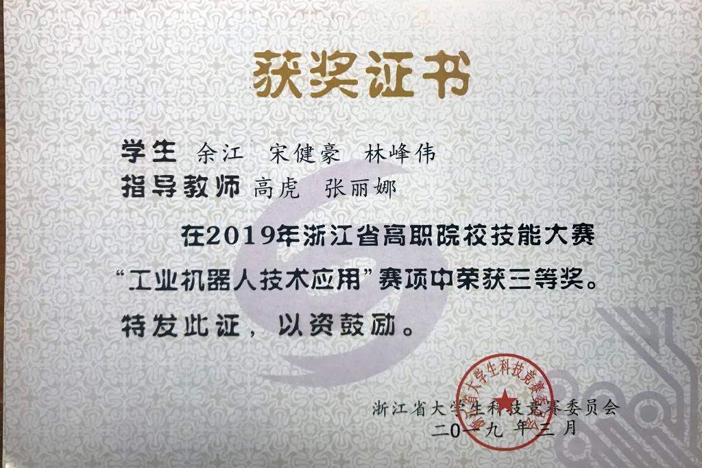 近日,2019年“汇博杯”浙江省高职院校技能大赛暨全国职业院校技能大赛选拔赛“工业机器人技术应用技能”大赛落下帷幕。国际教育学院2017级工业机器人班宋健豪、方晓静、林峰伟,2016级工业机器人班余江、徐政和2018级工业机器人班胡俊鑫组成的两支参赛队均荣获三等奖。我校也是两支队伍均获奖的6所高职院校之一。
