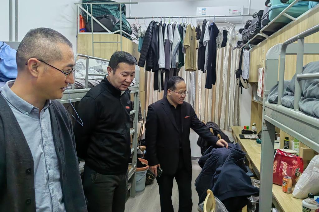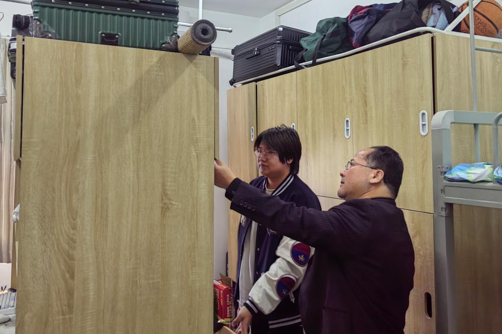 当检查组进入学生宿舍时,同学们纷纷起立问好。孔志光副书记与同学们亲切交流,询问同学们学习、生活和身心健康状况,倾听同学们心声,嘱咐同学们要牢固树立健康生活的意识,养成科学、健康的生活习惯,平衡好学习、生活之间的关系,做好学业规划,提升专业技能。