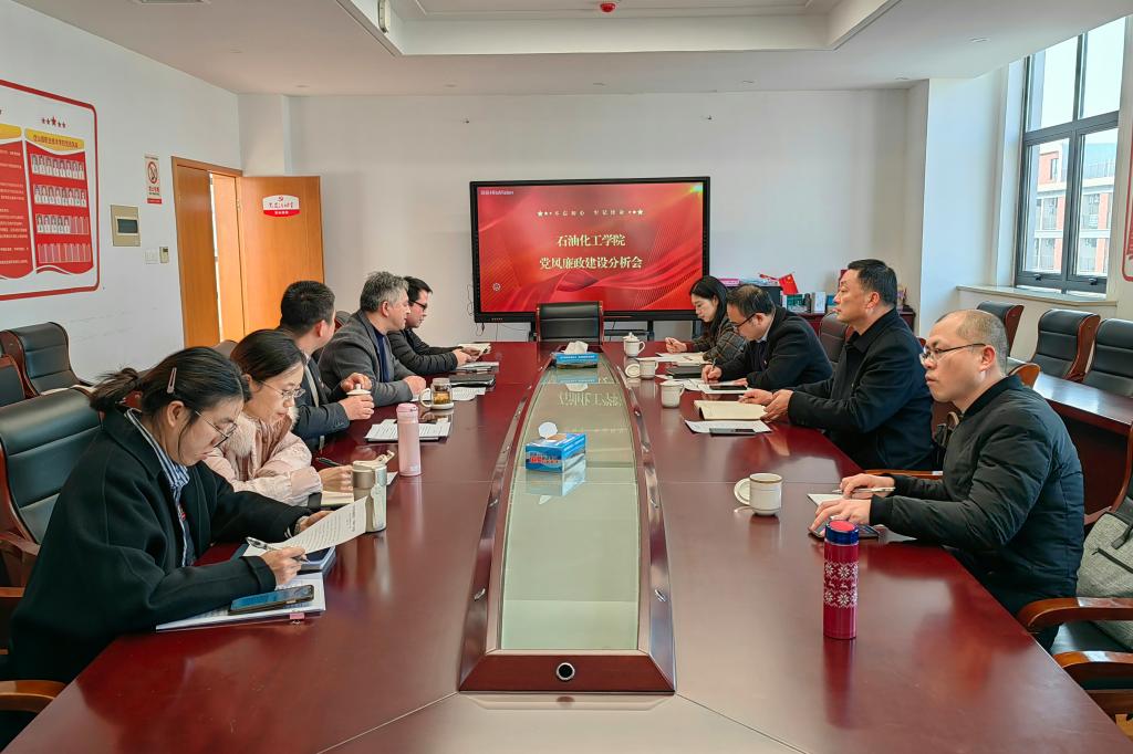 12月26日下午,石油化工学院党总支在508会议室召开了2024年度党风廉政建设分析会。校党委委员、副校长夏志刚,校党风廉政建设工作考核组成员苏峰、陈艳霞出席会议,学院班子成员参加会议,会议由学院党总支书记童华年主持。