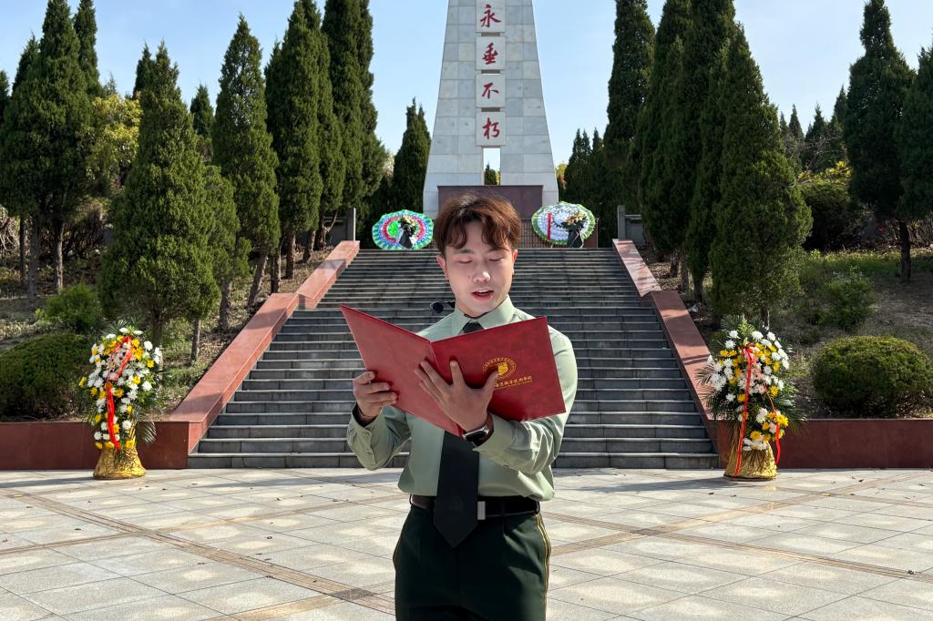 学生会主席、退伍军人徐昊韩发表了演讲。他回顾了革命先烈的英勇事迹,分享了自己在军旅生涯中的感悟,并呼吁同学们珍惜和平年代的来之不易,以先烈为榜样,传承红色基因,勇担时代使命。他鼓励同学们应将个人理想融入国家发展大局,以专业知识和实际行动为实现中华民族伟大复兴贡献力量。