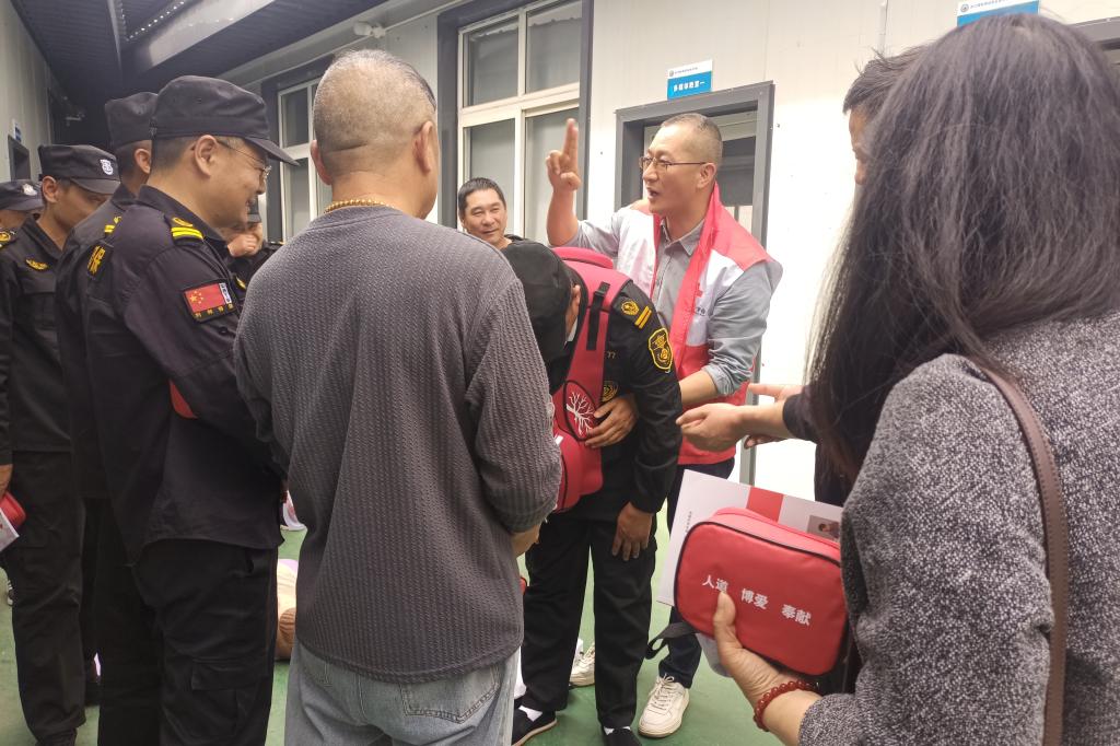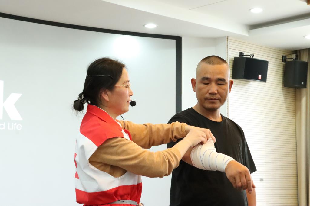 将活动推向高潮的是心肺复苏(CPR)+ 气道异物梗阻急救培训。应急救护师孙磊以真实案例为切入点,对心肺复苏的操作流程、胸外按压频率与深度、人工呼吸注意事项,以及AED(自动体外除颤器)的使用方法等关键内容进行了详细讲解,并借助人体模型,分步骤演示操作流程。学员轮番上阵实操,从判断环境安全、检查患者意识,到胸外按压、开放气道,每一个动作都力求精准到位。“手臂要垂直下压”“按压深度必须达到5厘米以上”“AED贴片位置要精准”…… 在分组练习过程中,救护师全程指导,帮助学员在反复实践中形成“肌肉记忆”,确保在紧急时刻能迅速、准确施救。