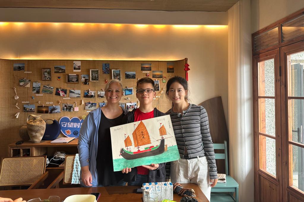 团队成员与“守望时光”海岛支老项目组深入交流,了解到这所曾承载几代岛民童年记忆的小学,如今化身为融合渔文化特色的托老所。团队还拜访了“渔民画家”胡华成阿公的家,85岁的老人颤巍巍地展示着自己多年以来坚持创作的“海味”画作,并将一幅舟山传统“绿眉毛”帆船画作赠予外教,这份独特的创作成为跨文化交流的特别礼物。