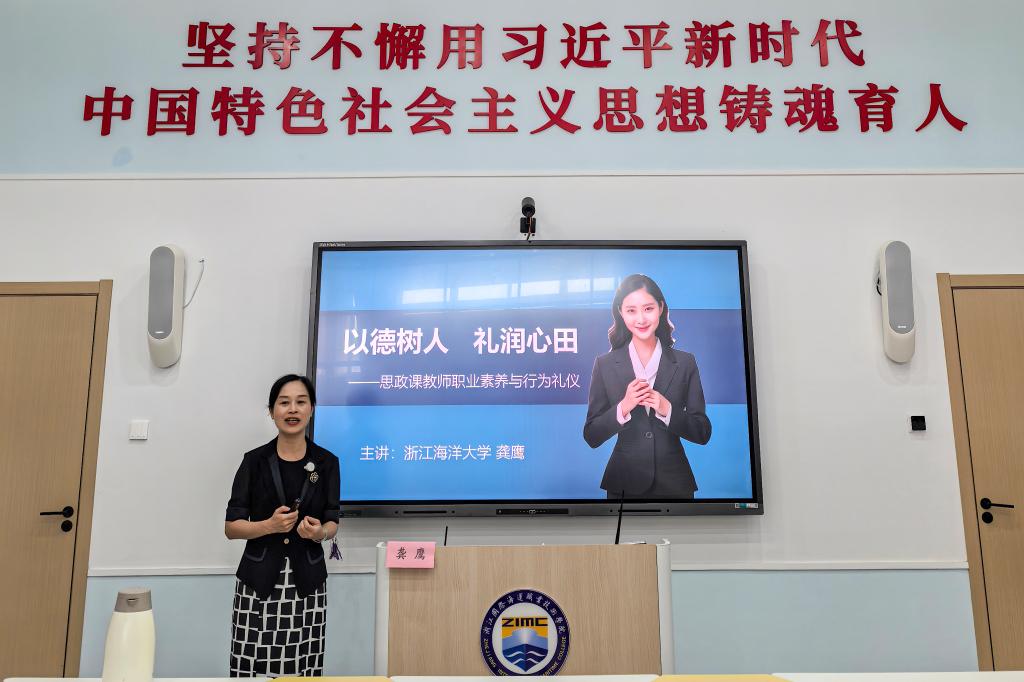 专题讲座环节,邀请浙江海洋大学马克思主义学院贝静红教授围绕“深入学习习近平总书记关于思政课建设的重要论述”,引导教师们争做“六要”思政“大先生”。浙江海洋大学龚鹰教授则以“思政课教师职业素养与行为礼仪”为主题,为教师们进行了专题培训,他从教师的职业素养、行为礼仪、职业风貌等方面入手,结合实际案例,深入浅出地阐述了思政课教师应具备的基本素质和形象要求,帮助教师们更好地塑造自身形象,提升教育教学效果。