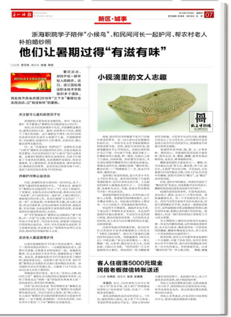 日前,新城和朱家尖南少的一些河岸边,来了一群朝气蓬勃的浙海职院学生。“青春治水 毅起同行”暑期社会实践团的“河小二”们,寻访了临城河、丁家塘河、长峙岛沿岸河堤等河道,聆听河长们的“水故事”,并与民间河长一起护河,上船打捞河污,体验他们的日常工作。队员们围绕“五水共治”、“三改一拆”、垃圾处理、灾害预防等主题,深入街头巷尾,穿过河道桥梁,总结出新城在水质环境、基础设施、文化內涵、企业发展等方面形成的成果,亲身感受新农村建设带来的巨大变化。