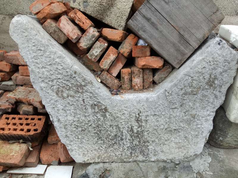 这一件老石器叫“元宝石”,位于岱山高亭大岙文明路赵家山嘴。老石器堆放在居民家的一处外墙,像元宝模样,两头翘起,中间凹形,当地人称为“元宝石”。