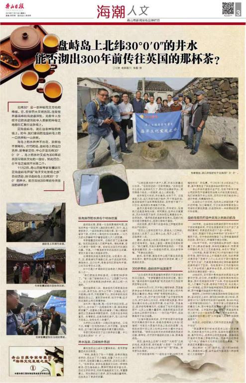 11月2日,舟山日报专家智囊团在定海盘峙岛开展“海洋文化发现之旅”首站活动,探寻盘峙岛上北纬30°0′0″的井水,能否沏出300年前传往英国的那杯茶?
